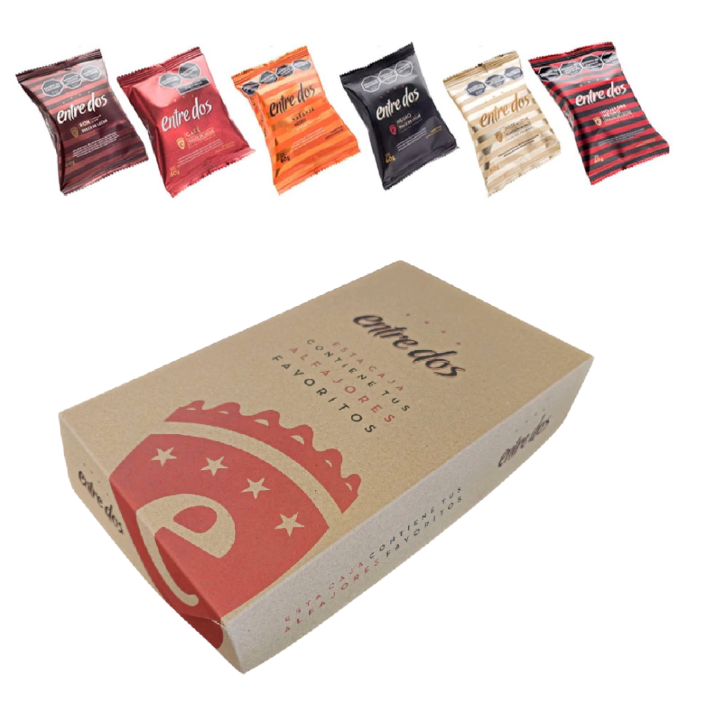 La caja viene prearmada con los sabores surtidos de la marca Entre Dos que tengamos disponibles