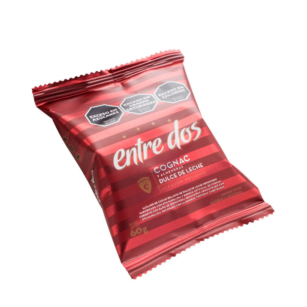 2 Alfajores de Chocolate rellenos con Dulce de Leche al COGNAC, cubiertos con baño de repostería semi amargo y almendras